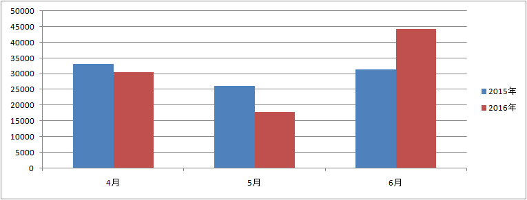 | 4月 | 5月 | 6月 | 2015年 | 33131.65 | 26198.54 | 31443.53 | 2016年 | 30600.57 | 17957.05 | 44218.79 |