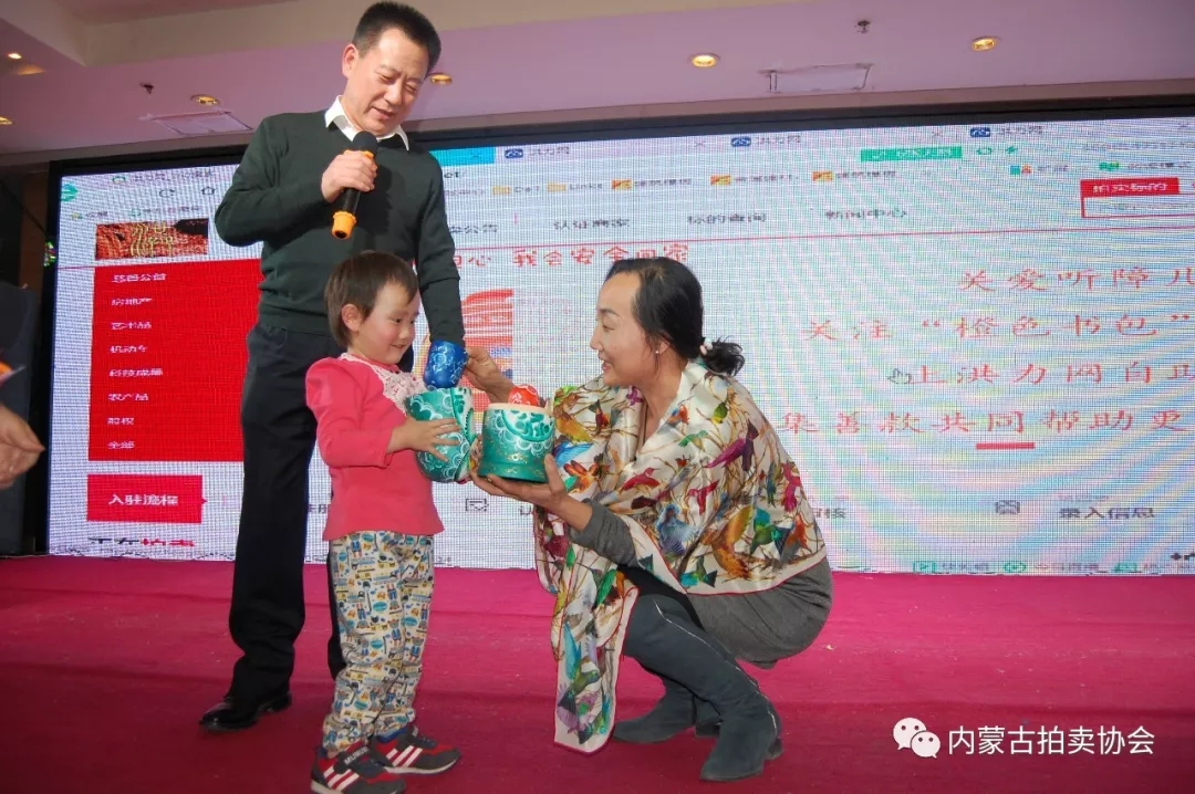 慈善拍賣會上所捐的37件拍品全部成交。最后所拍善款將為內(nèi)蒙古自治區(qū)100個聽障兒童購買“橙色書包”(橙色書包 是2016年3月3日由中國聽力醫(yī)學(xué)發(fā)展基金會發(fā)起的公益項目,旨在為聽障兒童提供一個交通安全"護(hù)身符)。