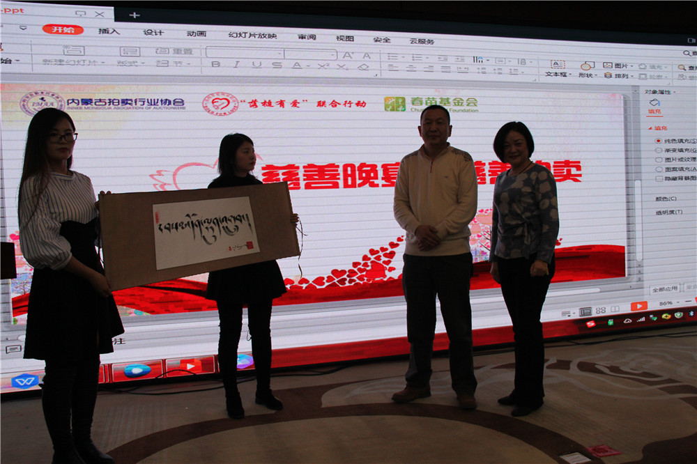 內(nèi)蒙古拍賣行業(yè)協(xié)會(huì)王志江會(huì)長(zhǎng)與與拍賣師于闖及 捐贈(zèng)愛心人士  內(nèi)蒙古拍賣行業(yè)協(xié)會(huì)娜晴秘書長(zhǎng)與拍賣師于闖