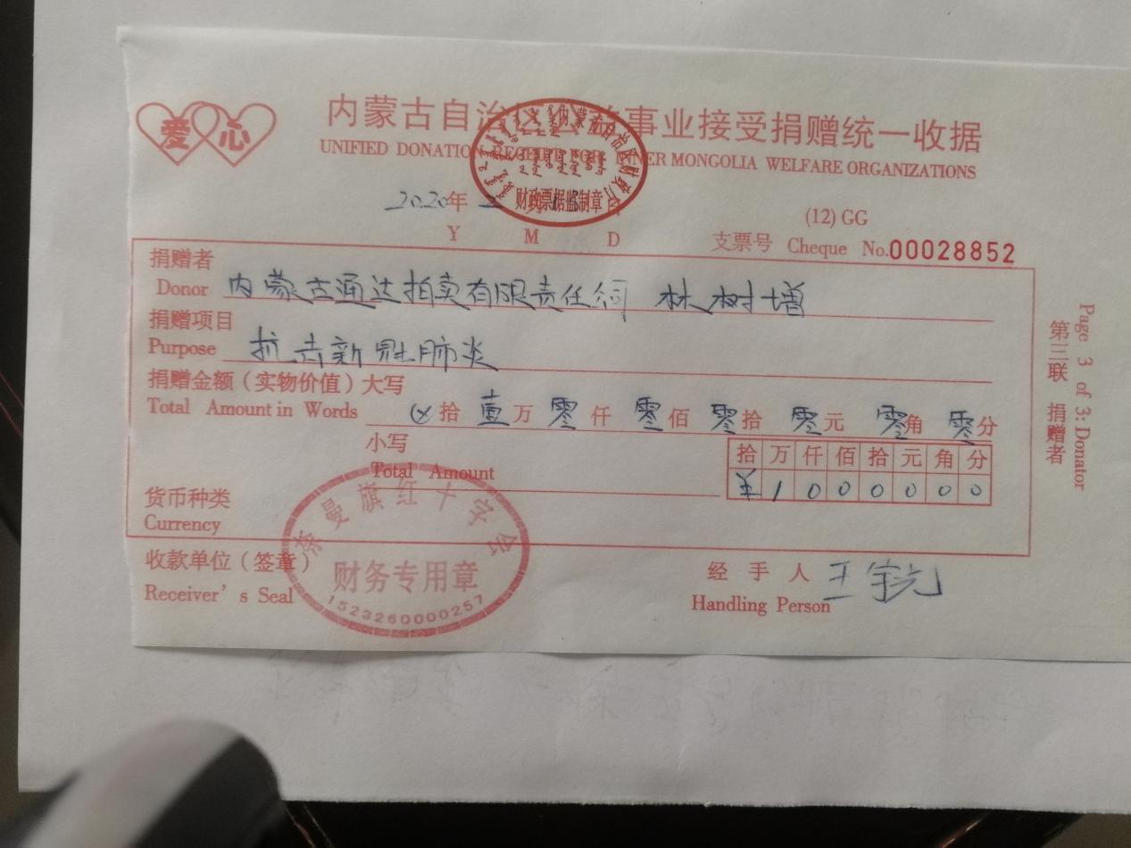 內(nèi)蒙古聯(lián)興拍賣有限責(zé)任公司向內(nèi)蒙古自治區(qū)紅十字會(huì)捐贈(zèng)了1000元防控疫情基金。內(nèi)蒙古拍賣愛(ài)心人士李虹、王鳳林、齊銘分別捐贈(zèng)了600元、500元、200元的愛(ài)心善款。