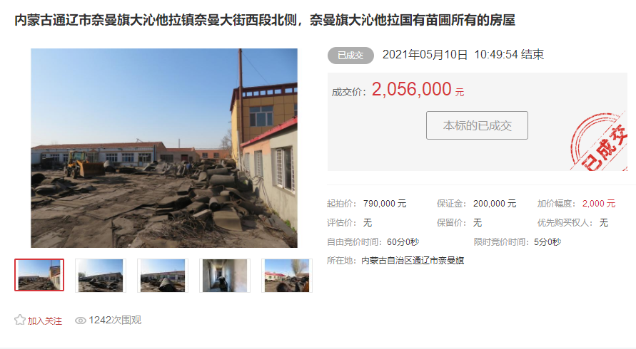 2021510日上午,奈曼旗財政局委托內(nèi)蒙古通達(dá)拍賣公司拍賣位于通遼市奈曼旗大沁他拉鎮(zhèn)奈曼大街西段北側(cè),奈曼旗大沁他拉國有苗圃所有的房產(chǎn)及土地增值126.6萬元,通達(dá)拍賣公司根據(jù)本次拍品的特點(diǎn),選用中拍平臺作為線上拍賣平臺,同時進(jìn)行線下推廣及現(xiàn)場宣傳,房產(chǎn)及土地起拍價為790000元,經(jīng)過3名競拍人53次的競價,最終以2056000元的價格成交,超出起拍價1266000元,溢價率達(dá)160%。本次網(wǎng)絡(luò)上拍,為公眾造了良好的競拍環(huán)境,增加了競拍參與機(jī)會,突破了地域限制,競買人足不出戶,動動鼠標(biāo)就可以充分的了解拍品的信息和價格,由于參拍人數(shù)沒有限制,大大增加了競拍機(jī)率同時,切實(shí)為本次國有資產(chǎn)處置提質(zhì)增效,有力彰顯了通達(dá)拍賣公司業(yè)務(wù)模式創(chuàng)新的成效。