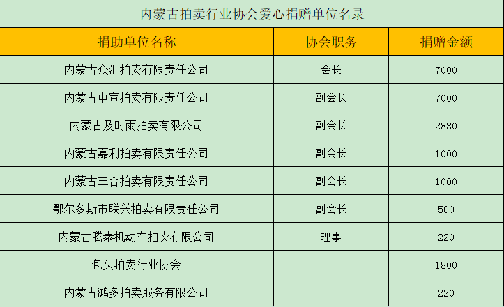 內(nèi)蒙古拍賣行業(yè)協(xié)會向額濟(jì)納旗紅十字會捐贈物資、防疫基金 的公示名錄 自協(xié)會2021年10月29日發(fā)起《關(guān)于防疫物資捐贈的倡議書》后,收到了我區(qū)多家拍賣企業(yè)捐贈的物資和防疫資金。本次捐贈活動于2021年11月12日中午12:00結(jié)束。 現(xiàn)向社會各界公示愛心捐贈單位名錄: